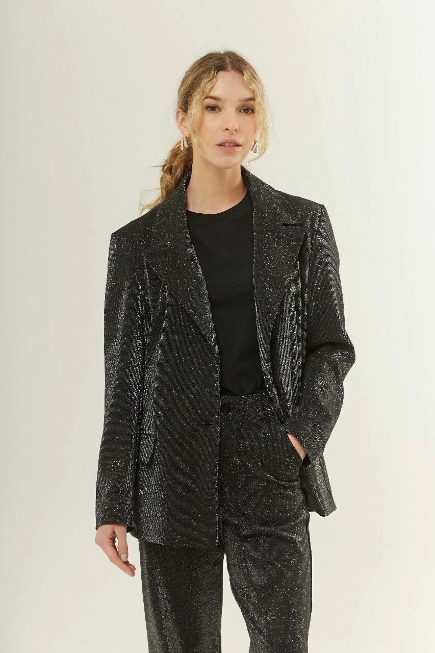 Blazer oversize de tejido sastrero con lurex con doble botón en el frente. Bolsillos ojal con tapa y terminaciones redondeadas. Especial para un total look con el pantalón Columba.