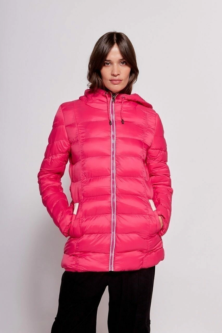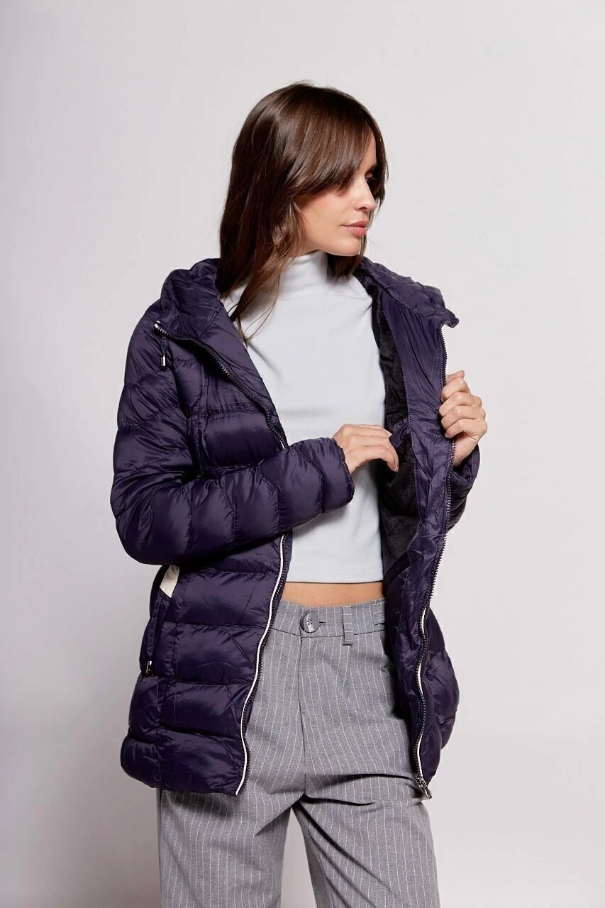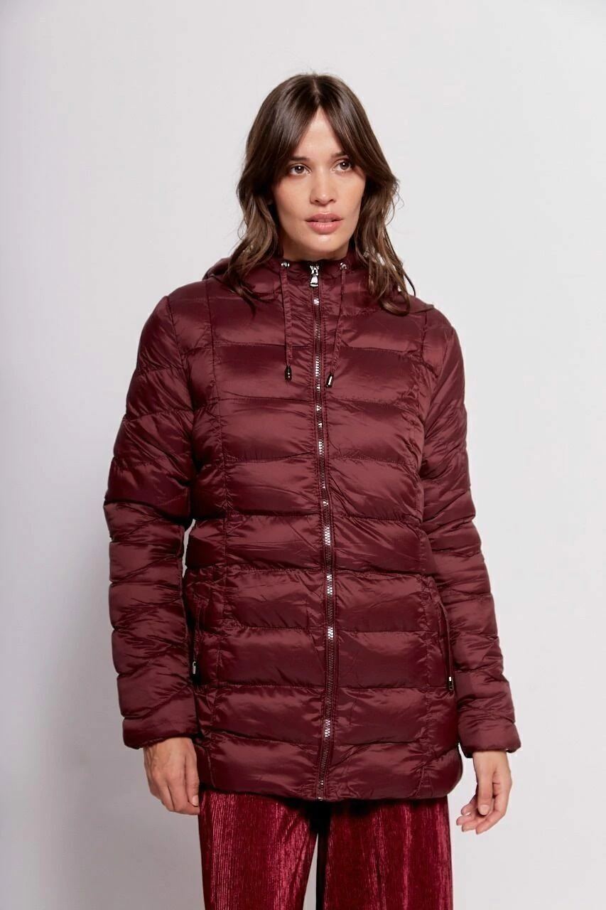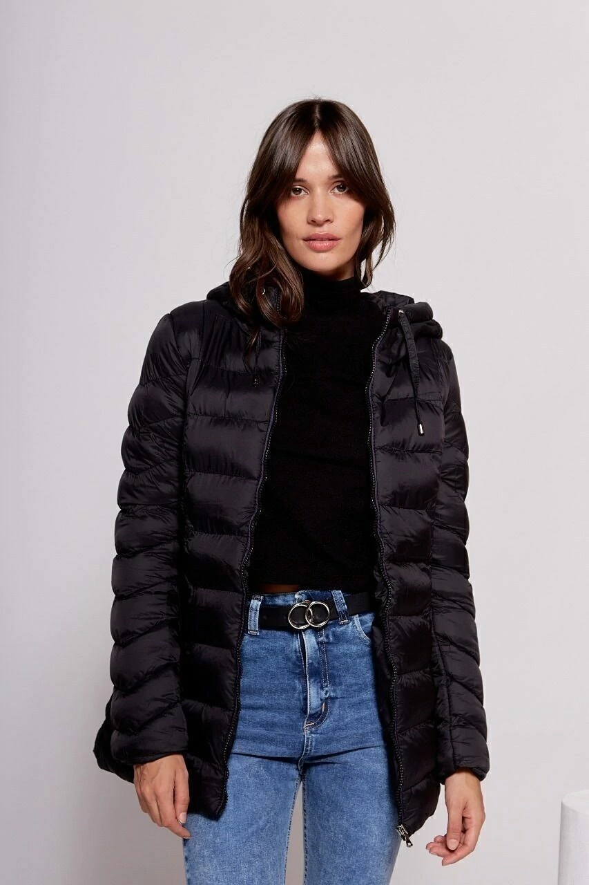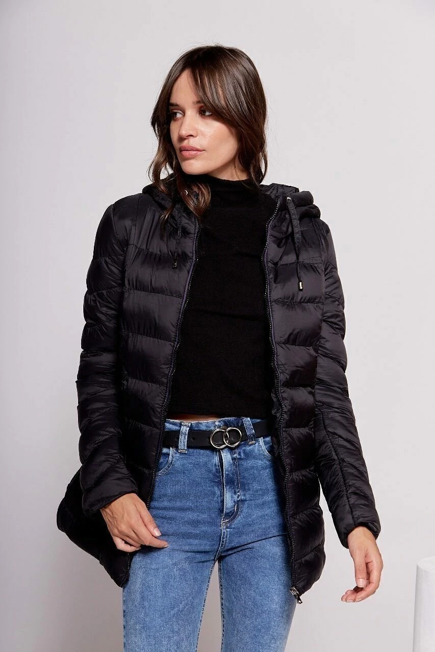 Campera larga ultraliviana de nylon con abrigo, bolsillo interno y capucha.