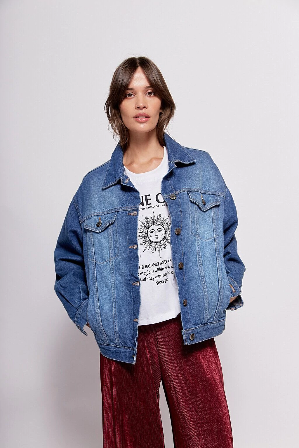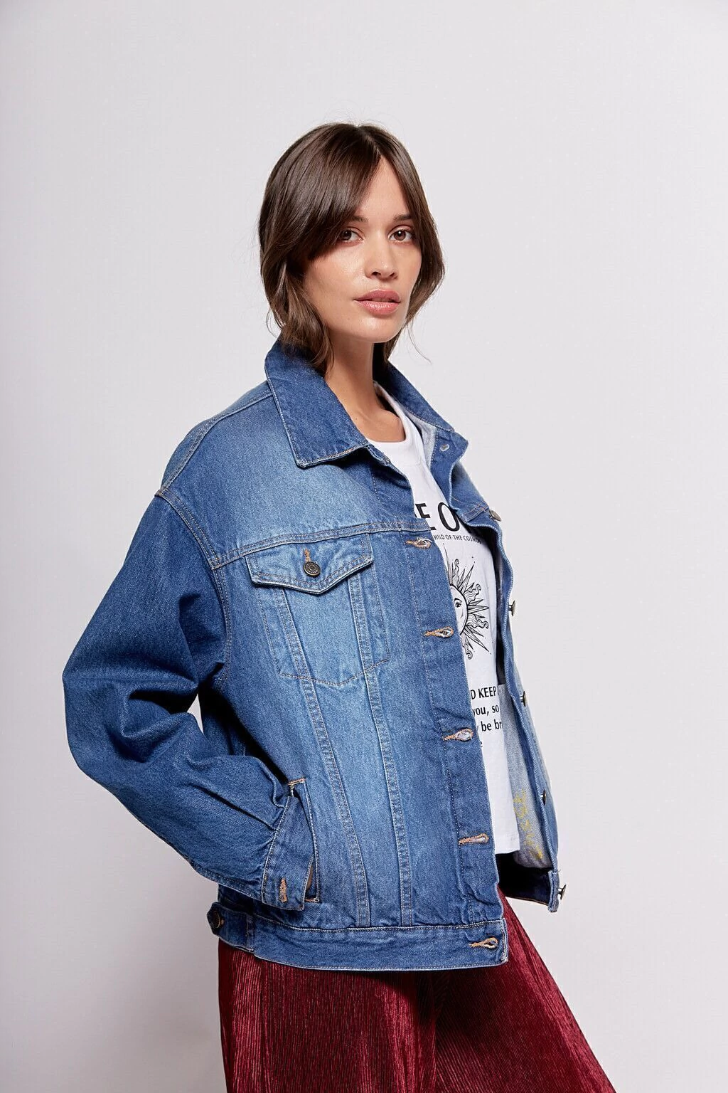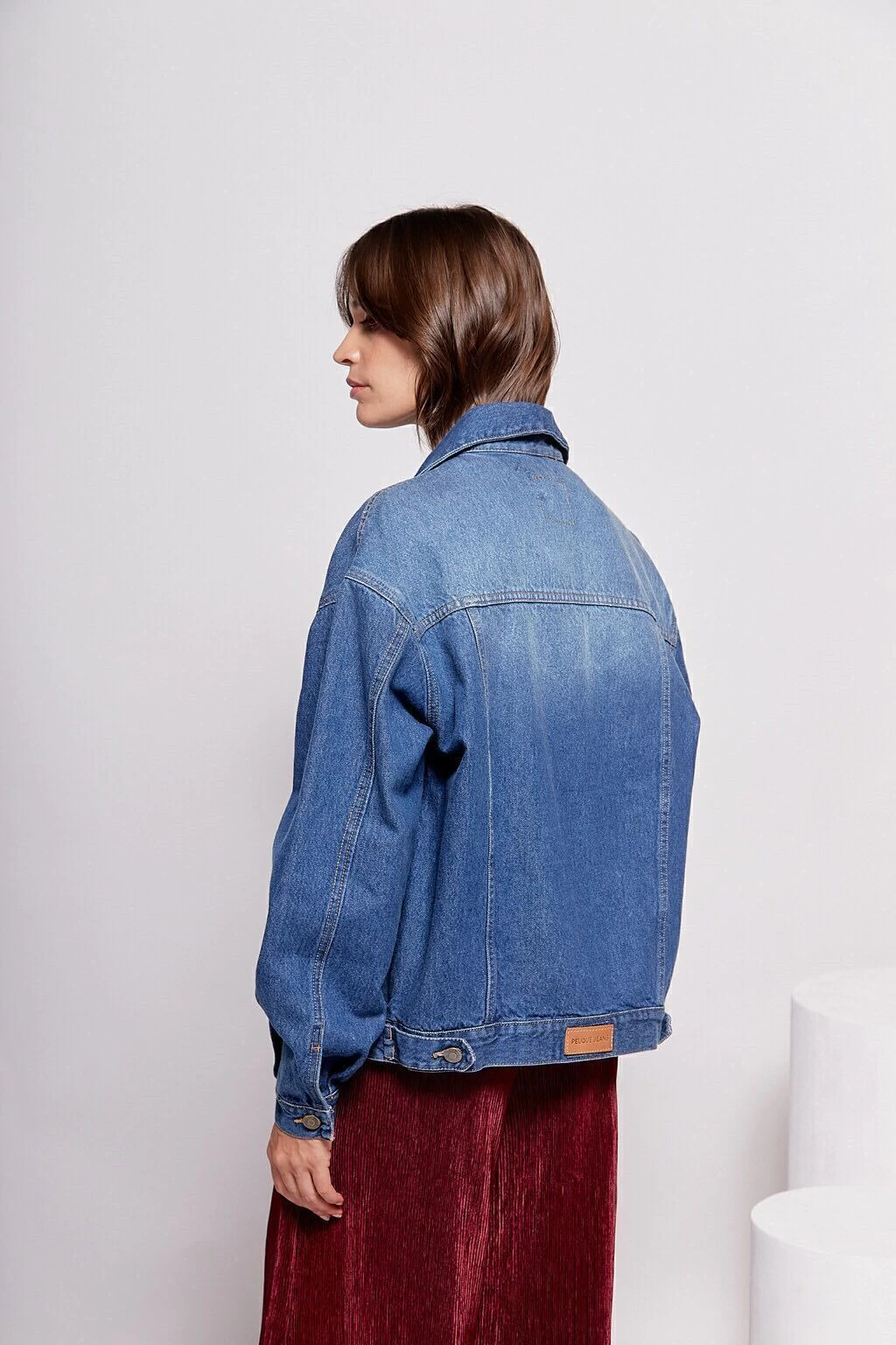 Campera oversize confeccionada en denim rigido lavado stone azul.