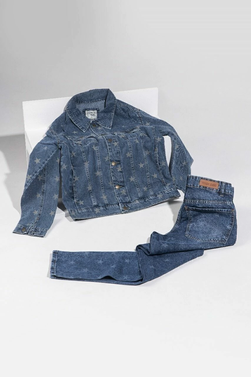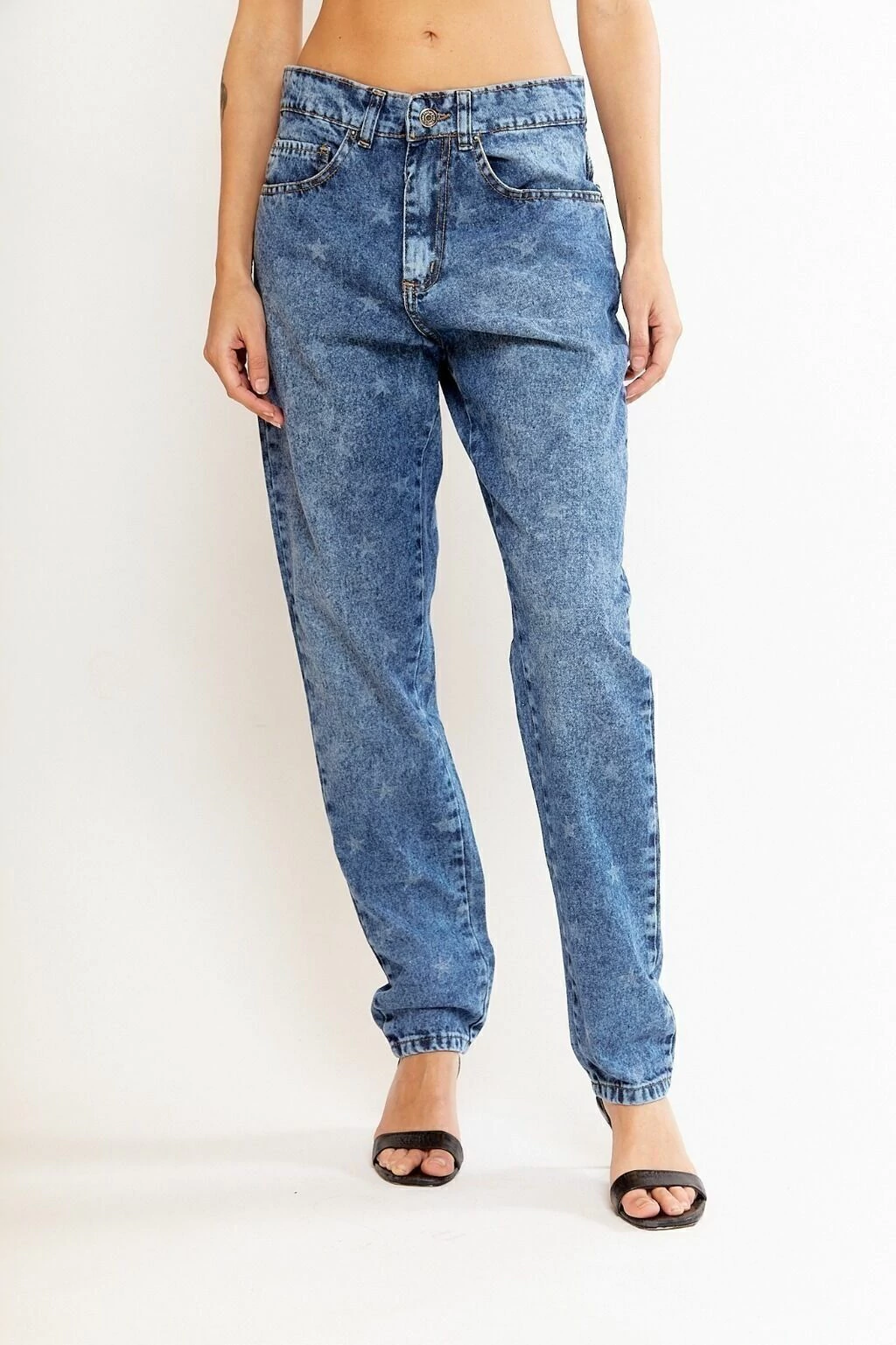 Jean Mom 5 bolsillos, calce relaxed o loose fit tiro medio, largo a los tobillos en tejido rígido con lavado azul gastado y laser con patrón de estrellas. Ideal para combinar con campera de jean Capella.