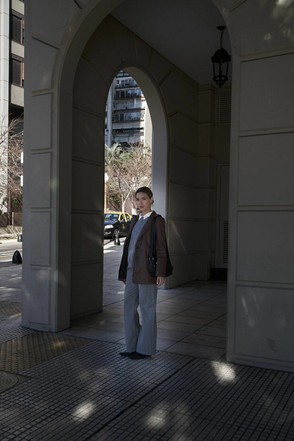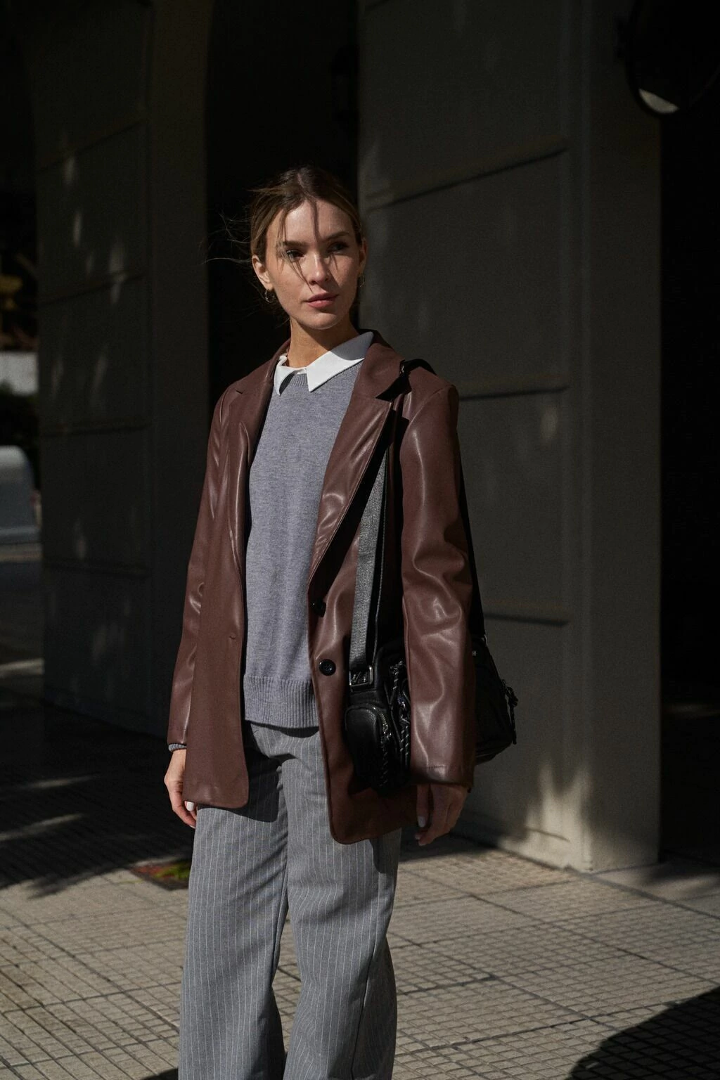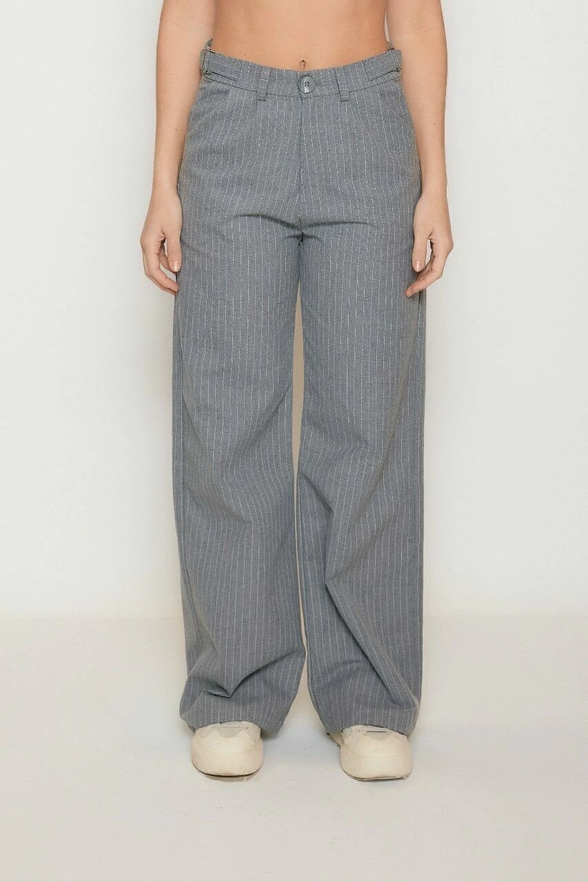 Pantalón de tejido sastrero rayado. Calce regular, tiro alto, wide leg con bolsillos y pinzas en el delantero, bolsillo ojal en trasero y cintura con lazos para pasantes en sus laterales.